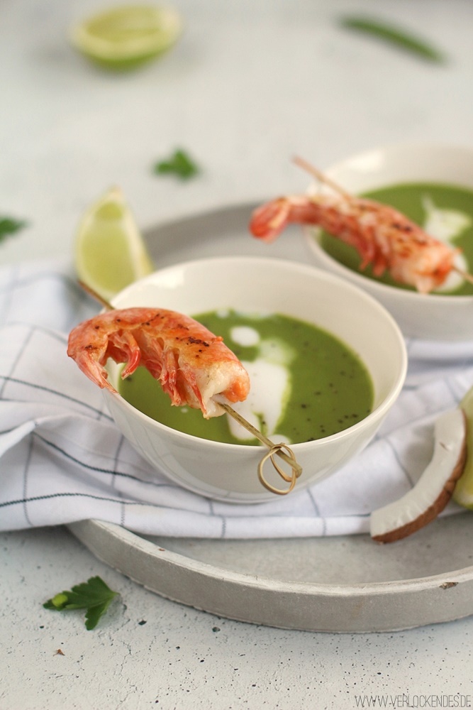 Leichte Erbsen Kokos Cremesuppe Mit Gebratenen Garnelen